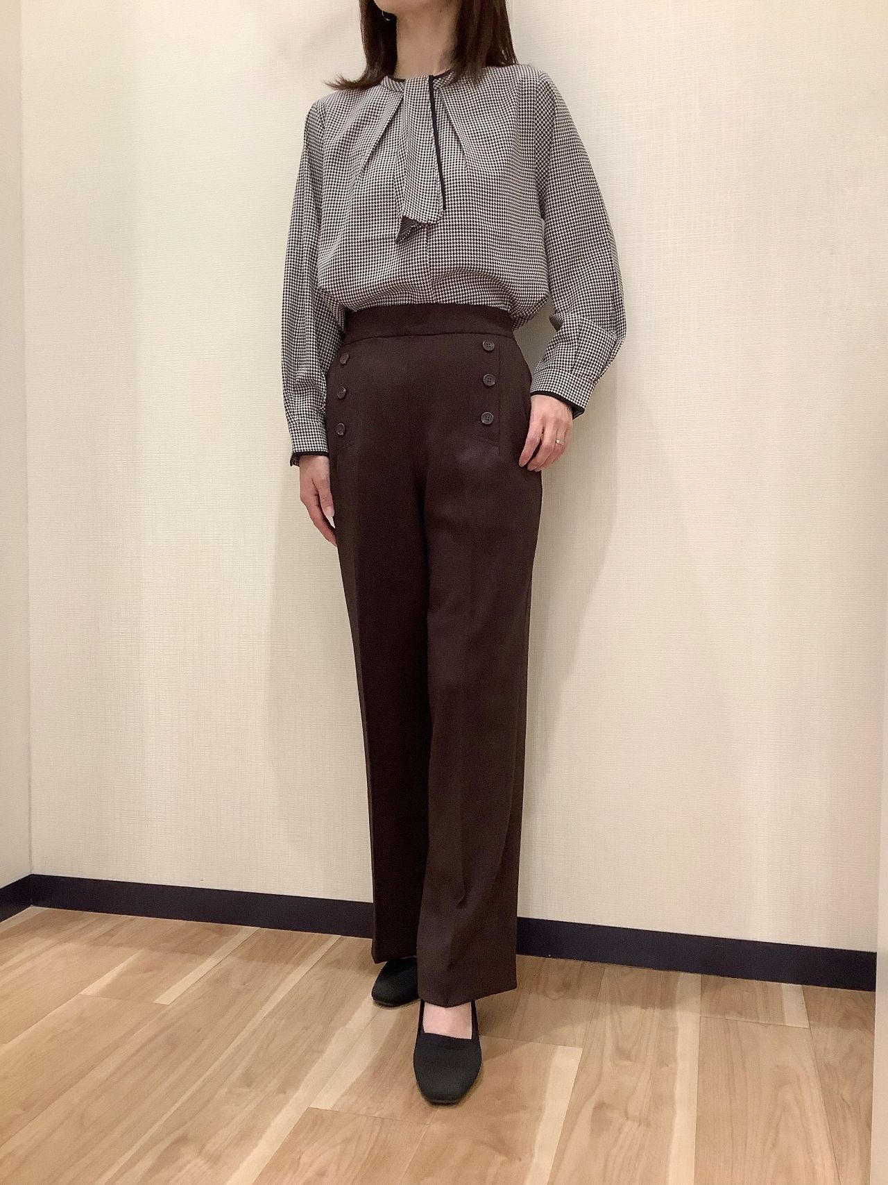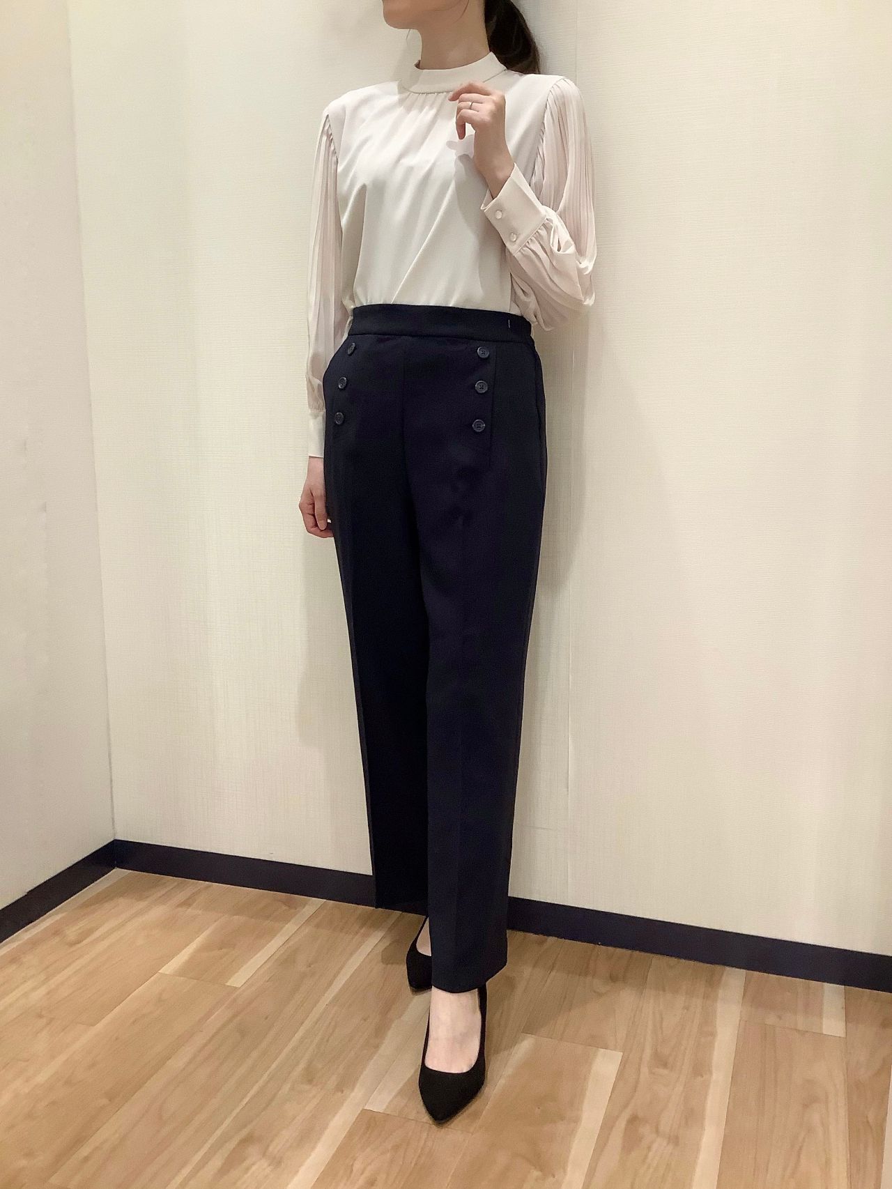 ボタンがポイントのパンツはブラウス一枚で