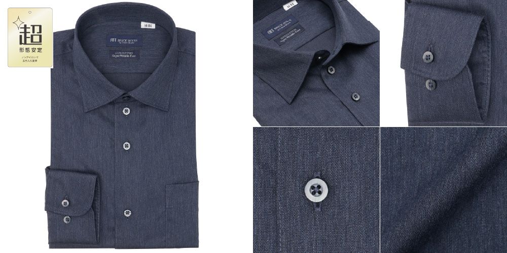 ●【超形態安定】 ワイド 長袖 形態安定 綿100% ワイシャツ(ネイビー)