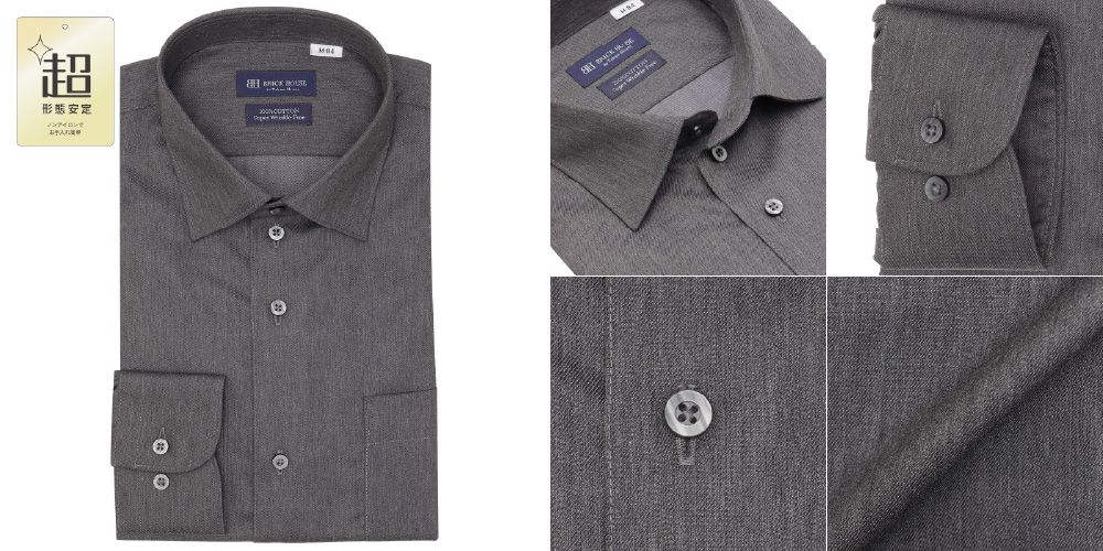 ●【超形態安定】 ワイド 長袖 形態安定 綿100% ワイシャツ(チャコール)