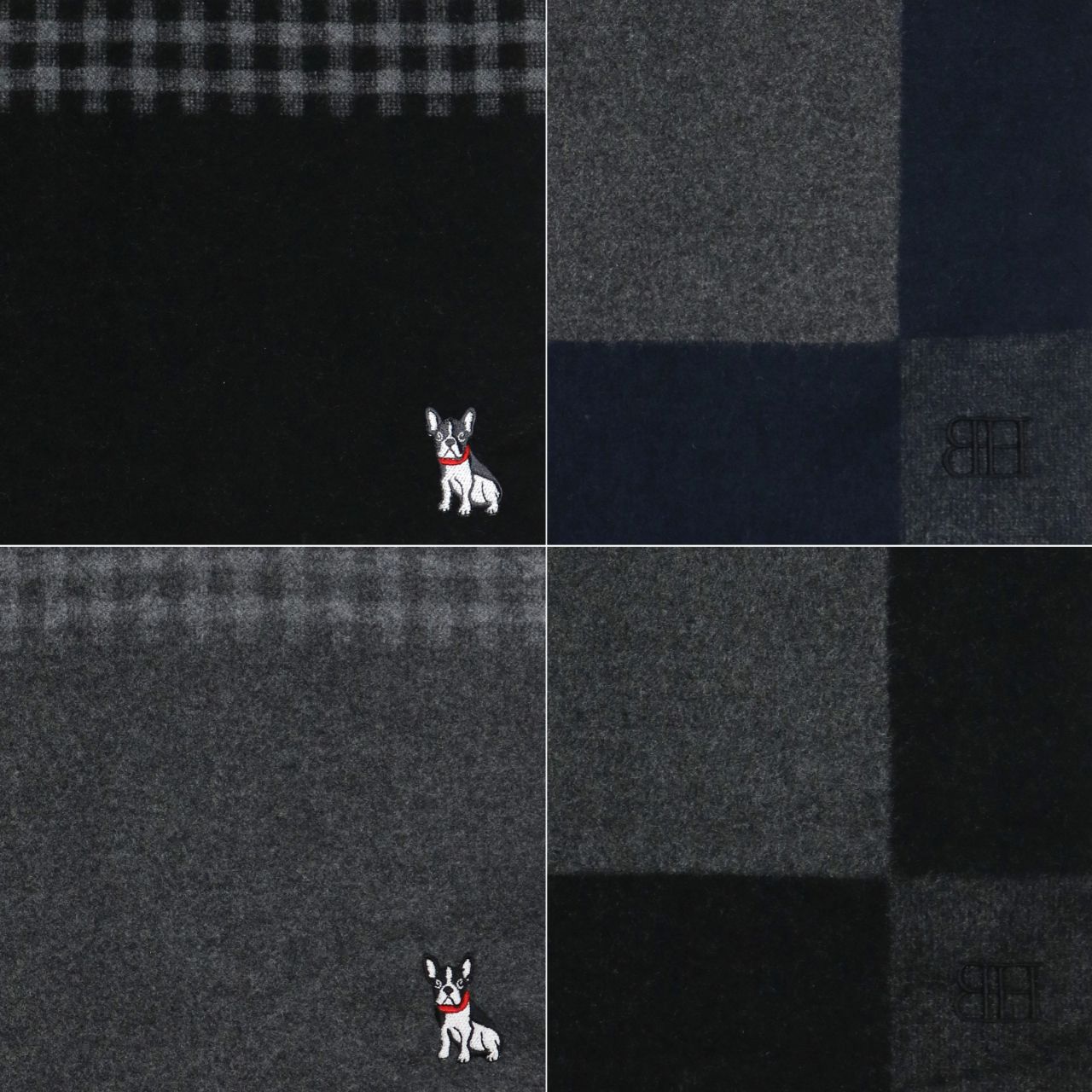 今回はフレンチブルドッグ・当店のブランドネーム「BH」の刺繍が入った刺しゅう入りマフラーです。