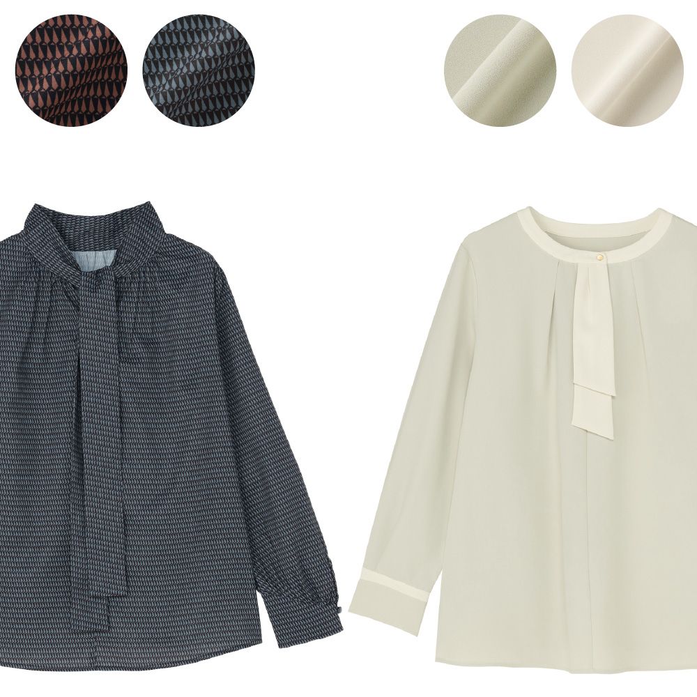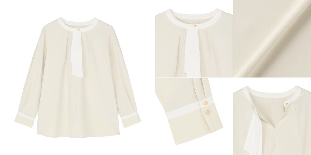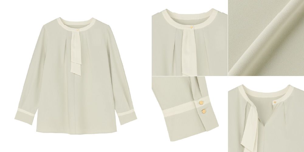 右側は【ストレッチ ジョーゼット 配色ボウタイブラウス 長袖 レディース】