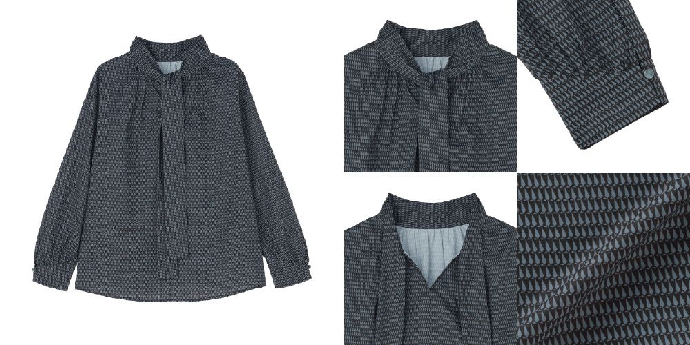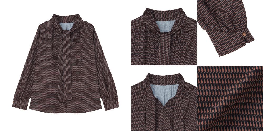 身頃と同じ幾何学模様のプリント生地を使用下ボウタイブラウスです。