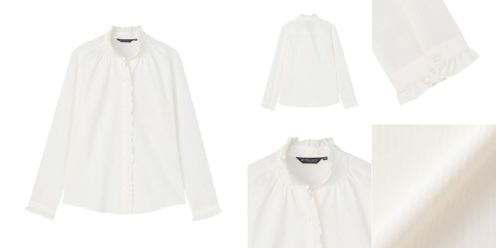 ▼【COFREX】 スタンド ゴムシャーリング ブラウス 長袖 レディースデザインシャツ(ホワイト)