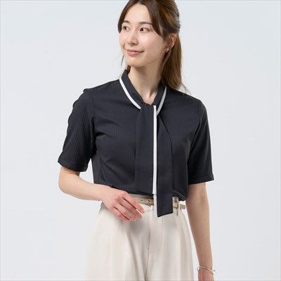 ●【COFREX】 配色ボウタイブラウス 五分袖 レディースデザインシャツ