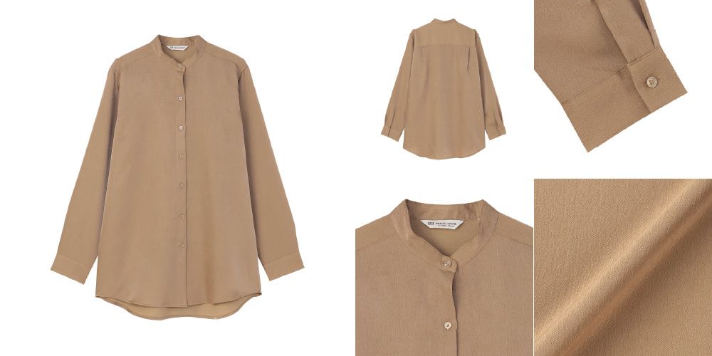 上のモデル画像はスタンド衿のシャツですが、レギュラー衿シャツもございます。