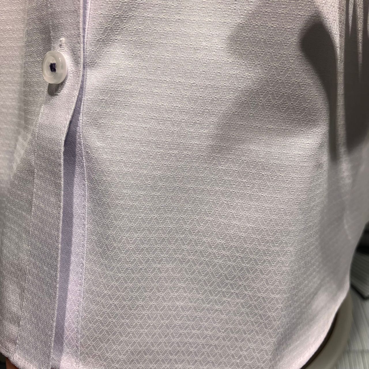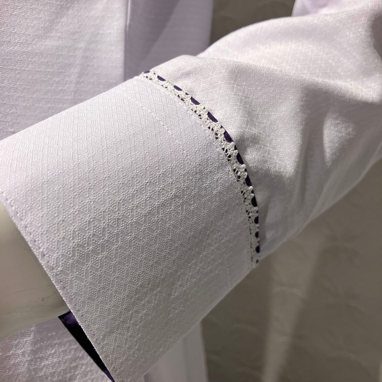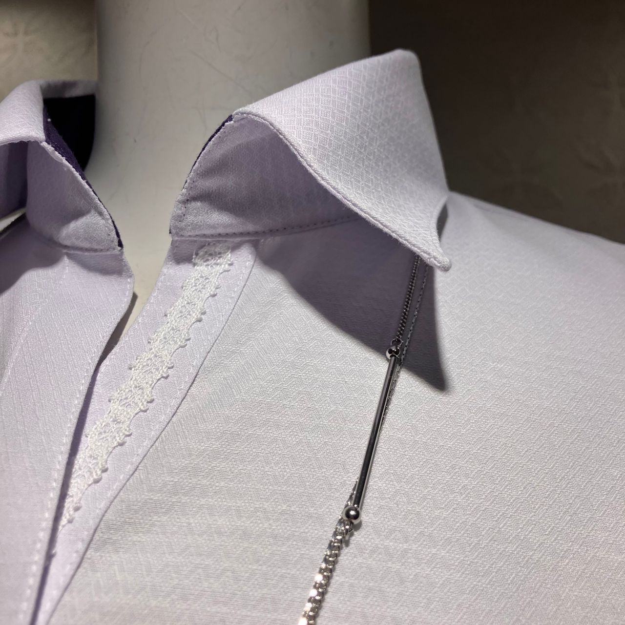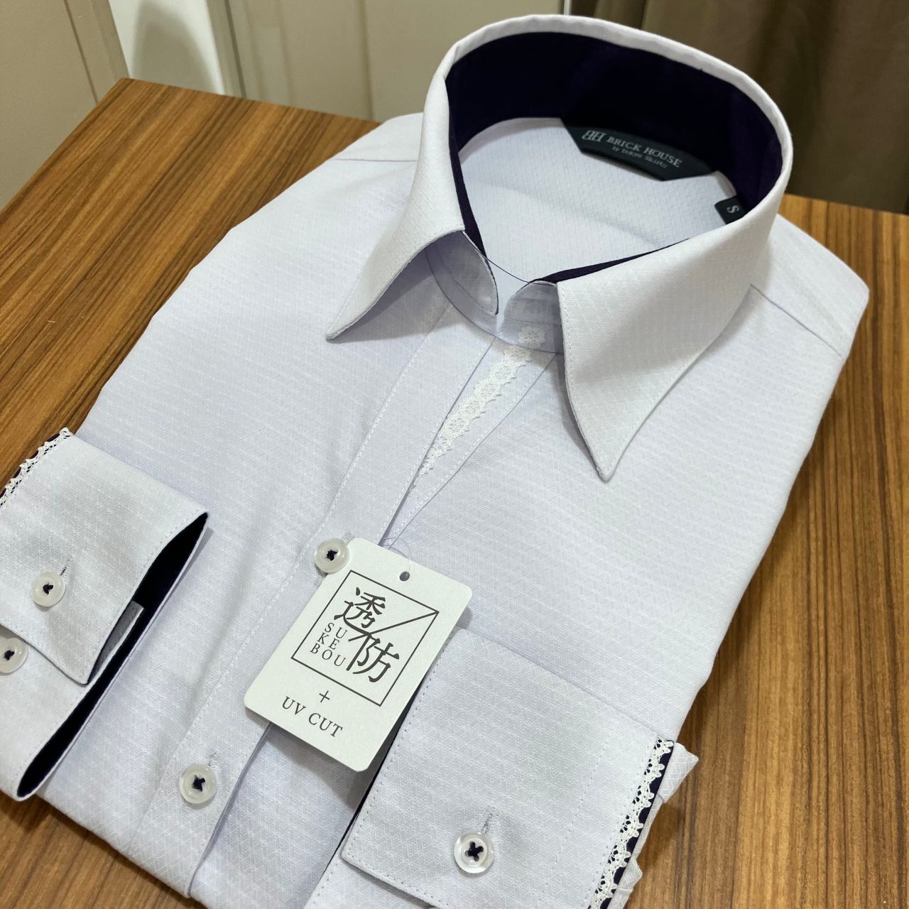 鎖骨近くの前立て部分と袖の手首まわりにレースをあしらった大人可愛い一枚です^ ^